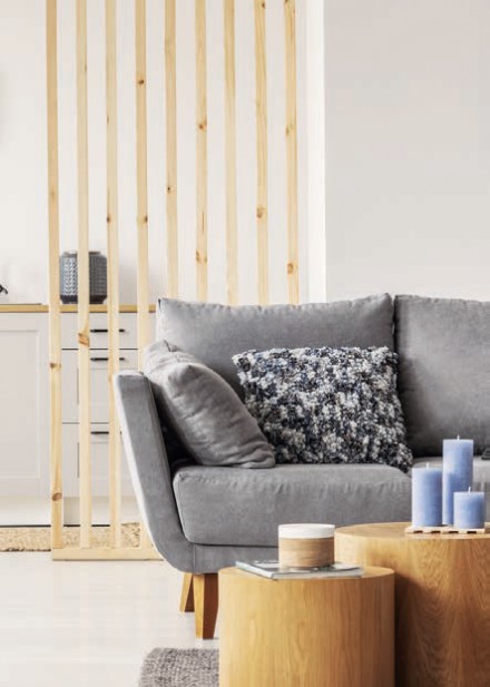 Drewno powraca do naszych wnętrz w zaskakujących formach. Jako ścienne okładziny spotykamy materiały posadzkowe: elegancki parkiet ułożony w jodełkę czy układaną poziomo deskę pokładową. Nikogo nie dziwi również zamontowany na ścianie fragment blatu kuchennego czy wycięta z niego regularna forma geometryczna. W modzie jest również „przedłużanie” ściany na inne płaszczyzny – boazeryjne wstęgi płynnie przechodzą ze ściany na sufit. Hitem są drewniane dekoracje 3D – przestrzenne panele i płyty z lamelowymi deszczułkami. Ozdobną okładziną może być również żaluzjowy parawan.