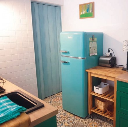 Często podczas remontu kuchni mamy pokusę dokonania w niej całkowitej rewolucji. Tymczasem zmian może wymagać tylko funkcjonalność i design zabudowy, a nie sam układ szafek oraz sprzętów. W tym przypadku kuchenny aneks oddzielony był od salonu murkiem, którego zadaniem było między innymi ukrycie ciągu roboczego. W murku były również instalacje wodno-kanalizacyjne. Szafki do przechowywania produktów i naczyń oraz lodówka umieszczone były na przeciwległej ścianie. Po długich debatach właściciele postanowili kupić całkowicie nowe wyposażenie, ale zostawić ten sam układ zabudowy. Pozostawienie murku pozwoliło uniknąć kosztownych zmian, związanych z przenoszeniem instalacji. Planując nową zabudowę, zrezygnowali jednak z szafek narożnych, kierując się przekonaniem, że proste ciągi zabudowy znacznie ułatwiają korzystanie z mebli. Dzięki precyzyjnemu rozplanowaniu wnętrz szafek poprawiła się także funkcjonalność kuchni. Dolne szafki zamykane drzwiczkami zastąpiono szufladami, które ułatwiają dostęp do produktów i naczyń. Liczbę szafek ograniczono do minimum – tutaj musi się zmieścić jedynie to, co niezbędne podczas kucharzenia na letnisku. Odzyskaną przestrzeń wykorzystano za to na większą lodówkę oraz zmywarkę. Dodatkowe miejsce do przechowywania i pracy zapewniają stoliki pomocnicze – barki na kółkach – jeden stanął między zabudową a lodówką, drugi pod oknem przy wejściu do aneksu. Spojrzenie na kuchnię z perspektywy saloniku przyciąga uwagę efektowną szmaragdową zabudową i turkusową lodówką w stylu retro. Będąc w środku aneksu, widzimy nowoczesną przestrzeń roboczą, a pracując przy niej mamy perspektywę na atrakcyjny pokój dzienny oraz zieleń ogrodu za jego oknami. Dawne położenie zabudowy nabrało nowego wymiaru. W takiej kuchni aż chce się gotować!